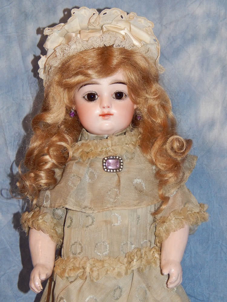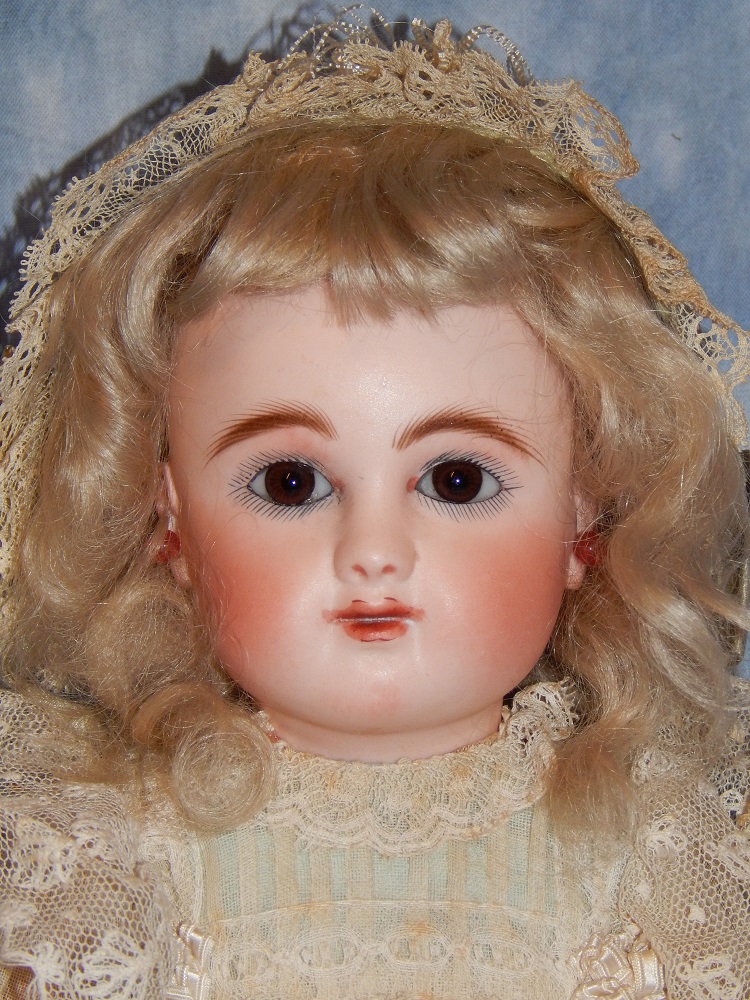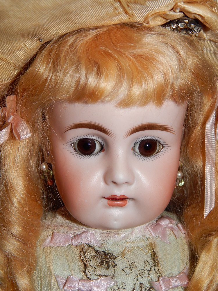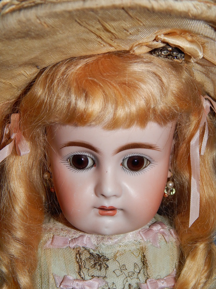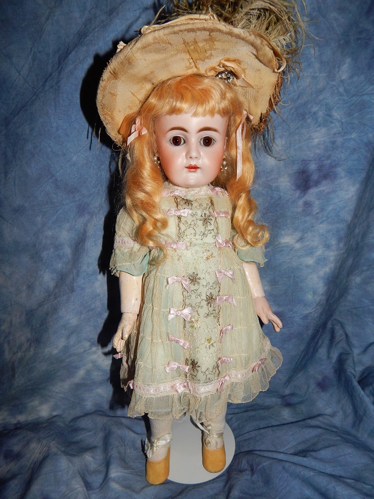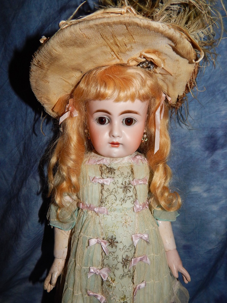 16" Early Bahr & Proschild #261, perfect bisque, brown sleep eyes with painted upper and lower lashes, beautifully outlined lips with an antique strawberry blonde mohair wig and her original pate. She wears a darling antique pleated organdy dress, antique undies and slip, antique shoes and a fabulous antique French hat. She is on her original early heavy BP six ball jointed body with the original shiny finish. She is AMAZING!!