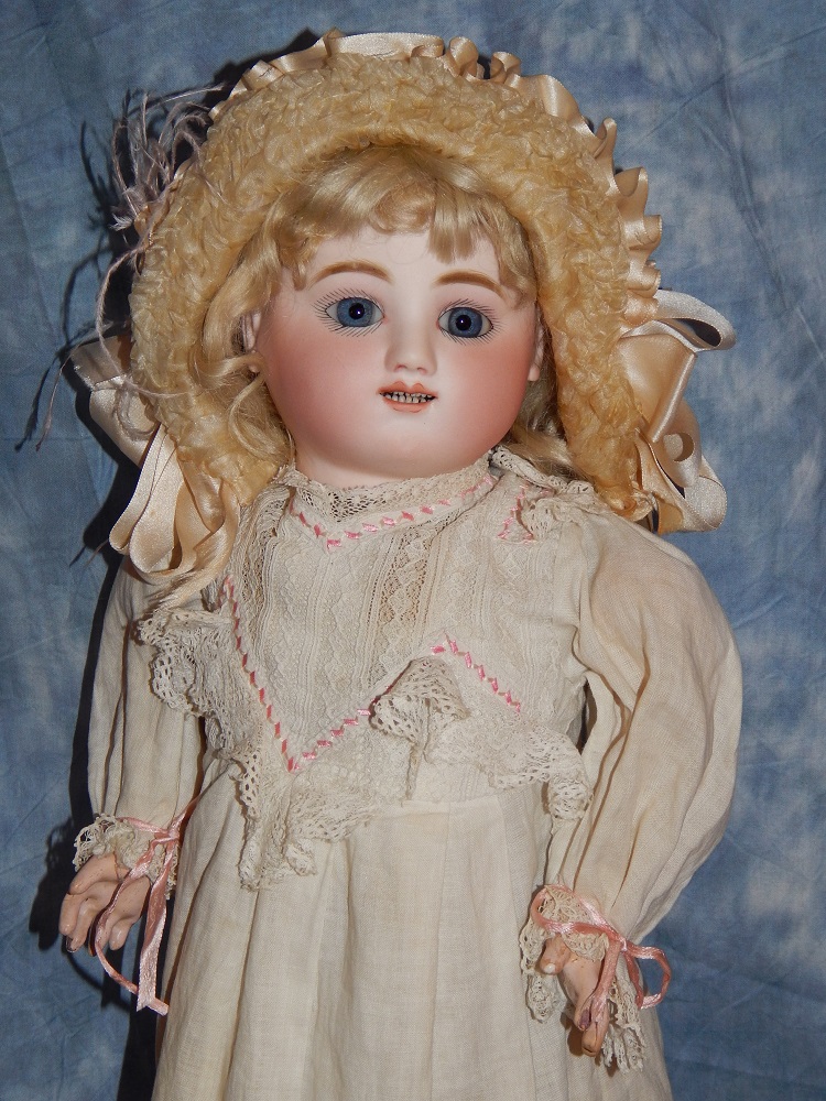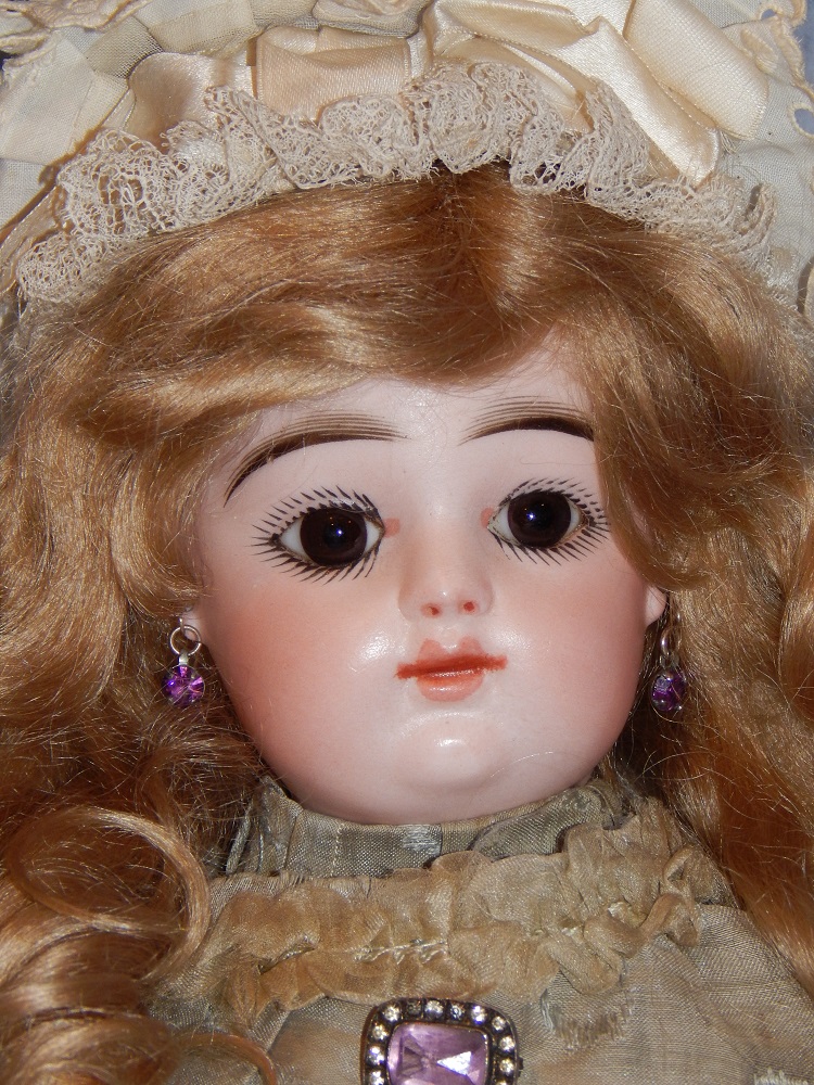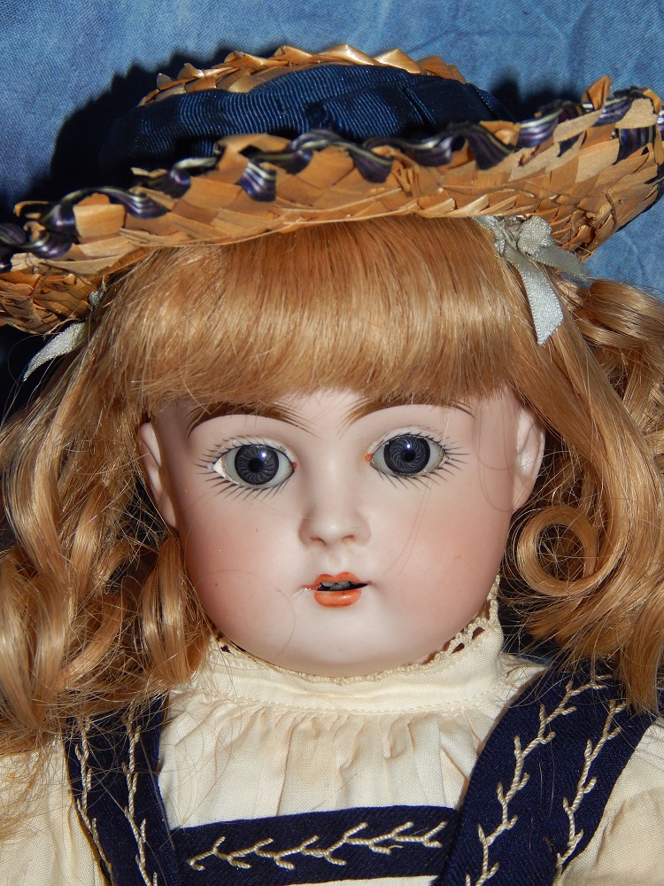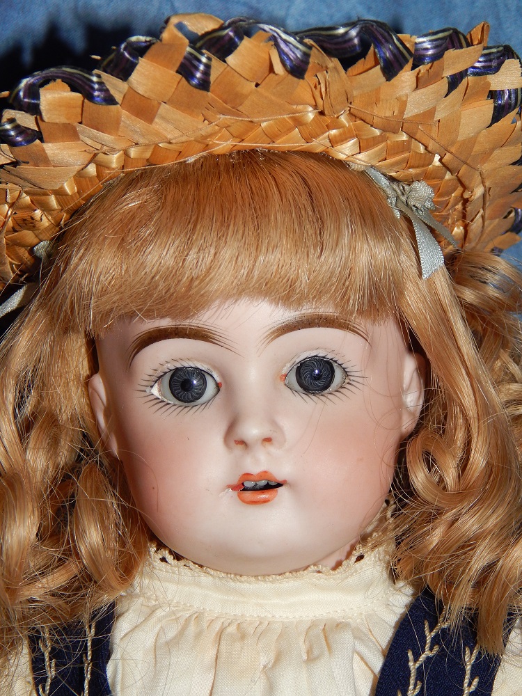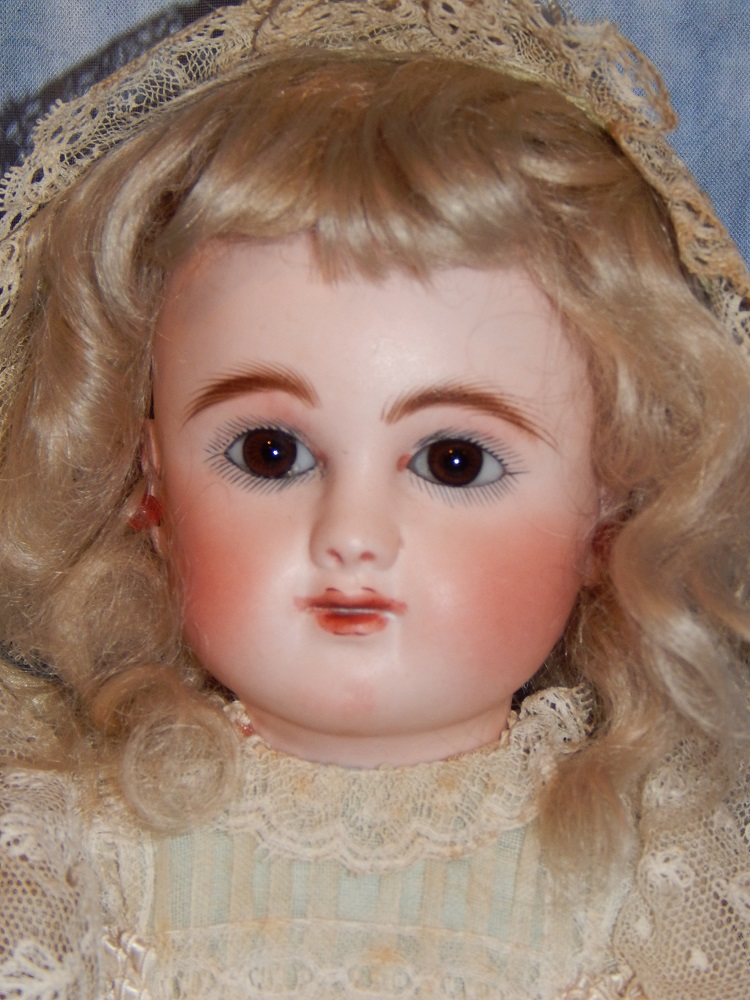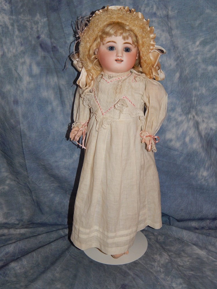 16" Early Bahr & Proschild #261, perfect bisque, brown sleep eyes with painted upper and lower lashes, beautifully outlined lips with an antique strawberry blonde mohair wig and her original pate. She wears a darling antique pleated organdy dress, antique undies and slip, antique shoes and a fabulous antique French hat. She is on her original early heavy BP six ball jointed body with the original shiny finish. She is AMAZING!!