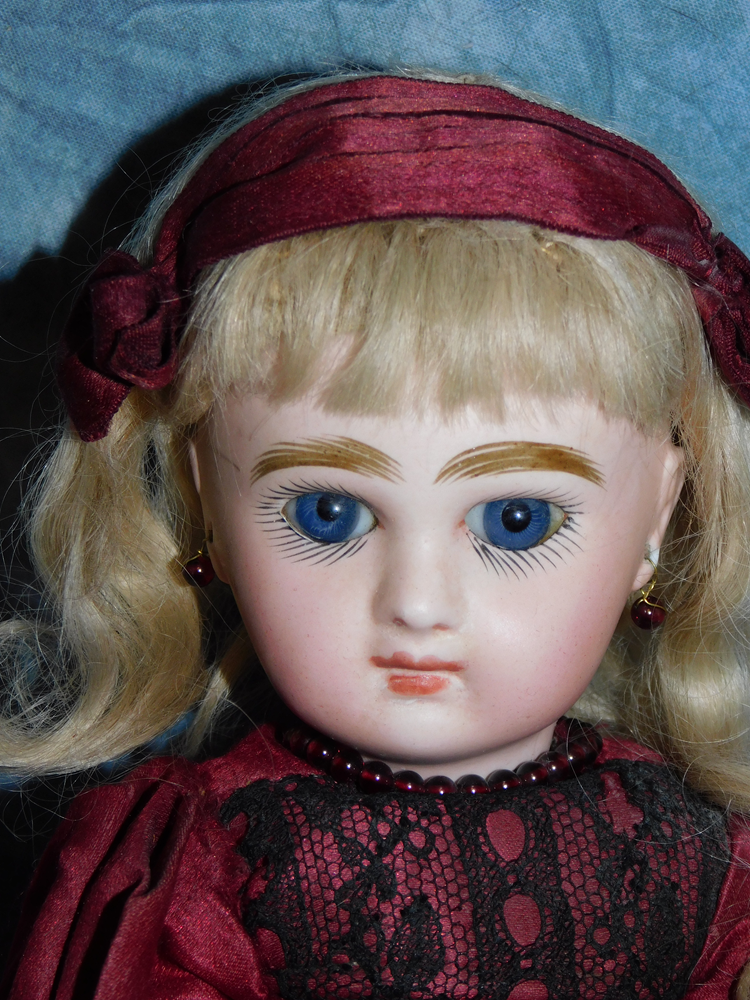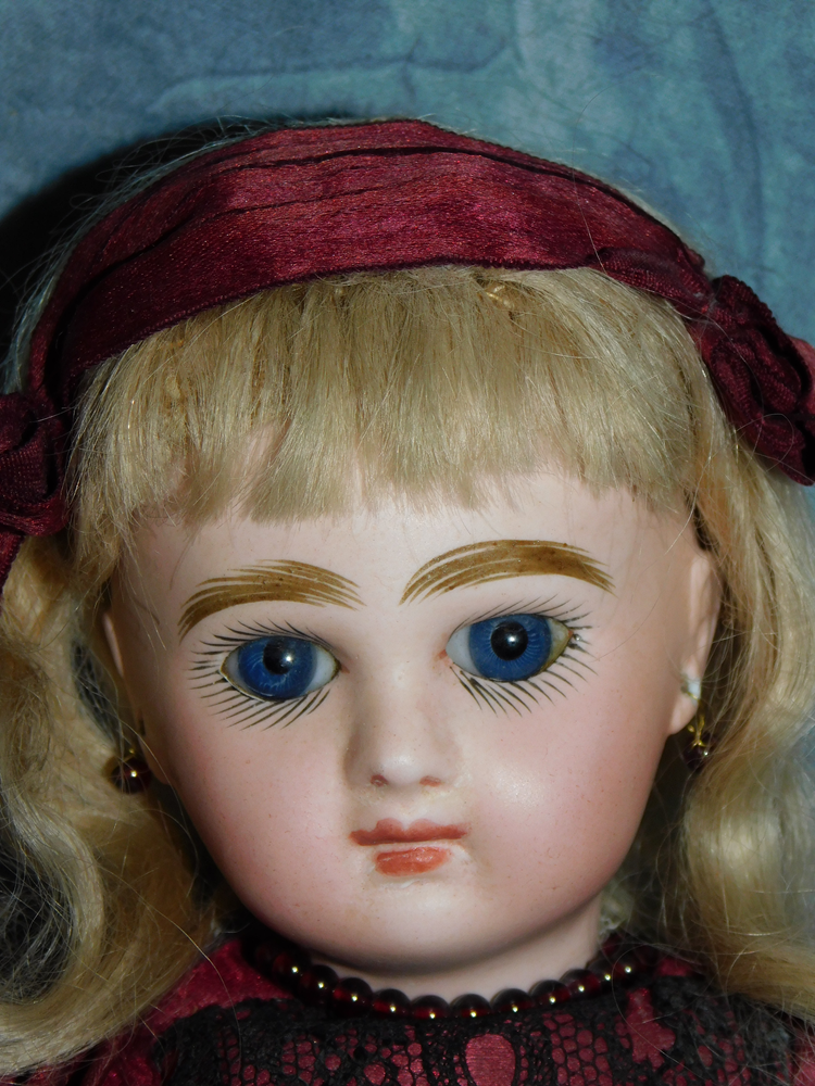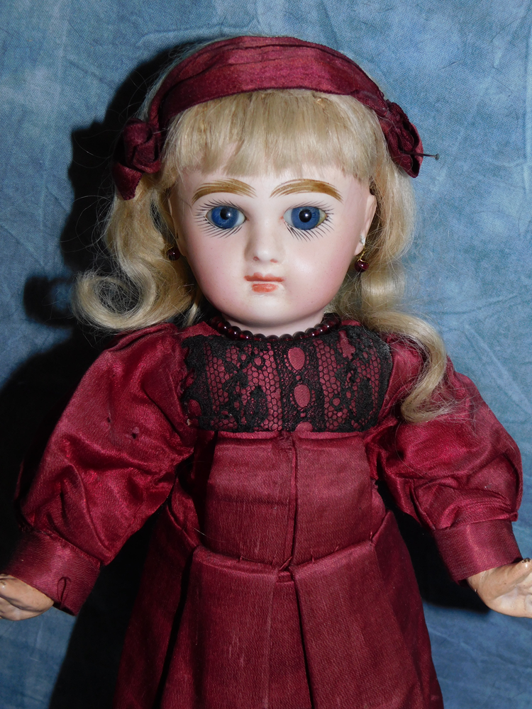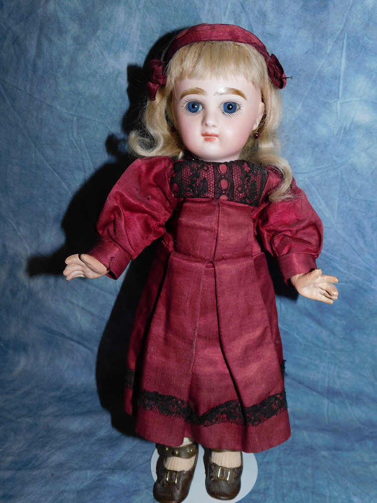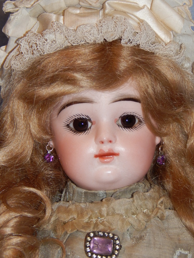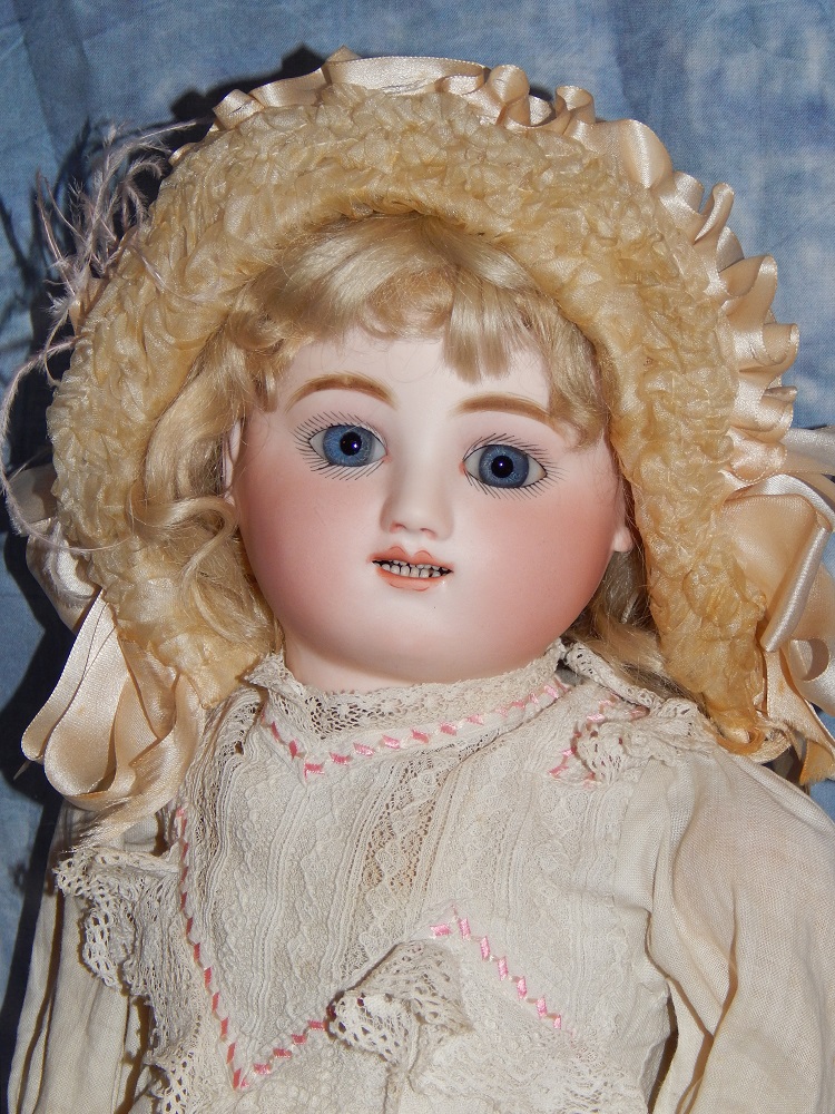 16" Early Bahr & Proschild #261, perfect bisque, brown sleep eyes with painted upper and lower lashes, beautifully outlined lips with an antique strawberry blonde mohair wig and her original pate. She wears a darling antique pleated organdy dress, antique undies and slip, antique shoes and a fabulous antique French hat. She is on her original early heavy BP six ball jointed body with the original shiny finish. She is AMAZING!!
