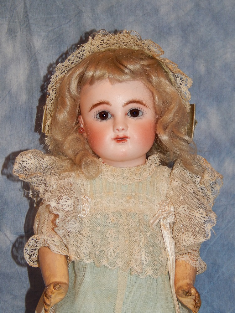 13” F.G. Scroll Bebe, big brown paperweight eyes, painted upper and lower lashes, gorgeous perfect dewy bisque,fabulous full beautiful newer dark blonde mohair wig and her original cork pate. She wears a fabulous antique French aqua silk dress, antique French shoes,antique crocheted socks and a magnificent antique French hat. She is on her original early 8 ball jointed straight wrist body (touch up on parts of body). Absolutely GORGEOUS!!! Only....