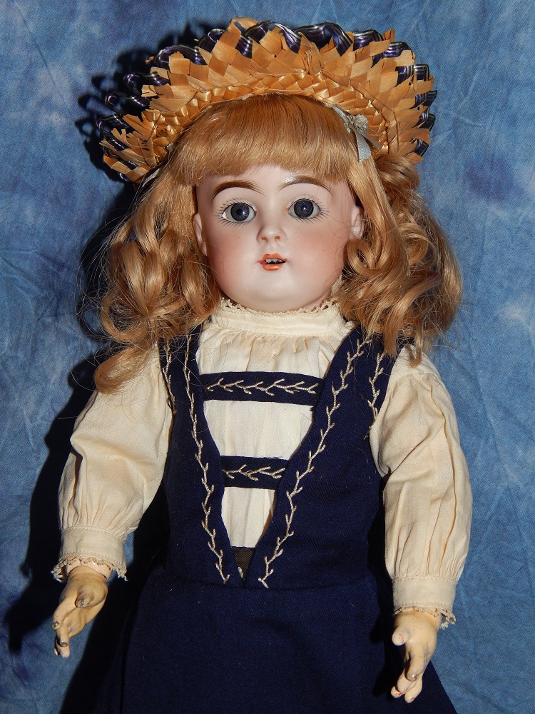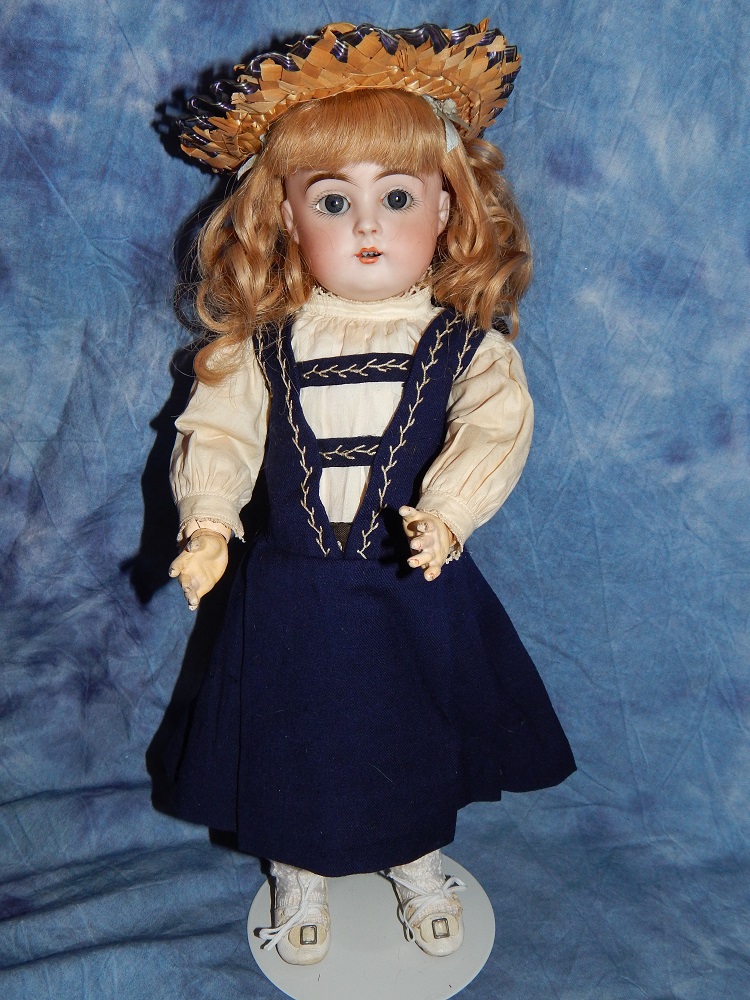 14" Kestner #152 Child, deep blue sleep eyes with painted upper and lower lashes, mint pale bisque, vintage strawberry blonde human hair wig and her original Kestner plaster pate. She wears a darling antique navy blue jumper and white cotton under blouse, French antique navy blue edged straw hat with navy blue silk ribbon band and her original antique white leather shoes with both buckles. She is on her original "signed" Kestner body with a great clean original finish. Great cabinet size and is one of the most beautiful of the Kestner mold numbers. DARLING!!!