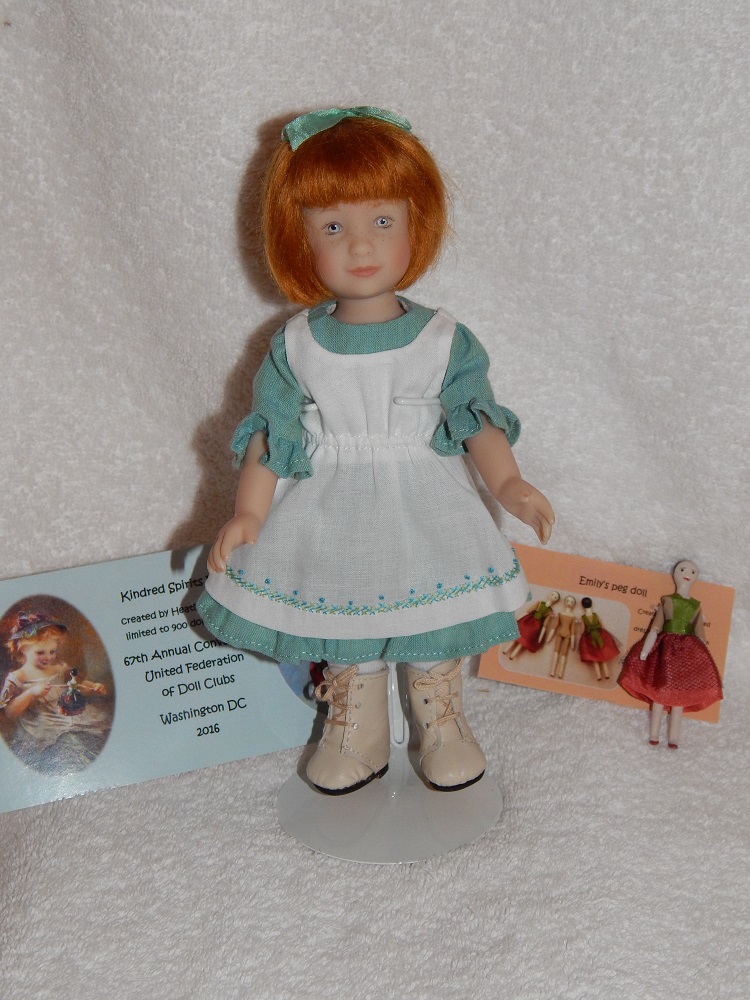 8" 67th Annual Convention Doll, "Kindred Spirits Emily", ltd. to 900 for the United Federation of Doll Clubs, Washington, DC 2016. Certificates of Authenticity comes with Emily and her wooden peg doll. They are in perfect condition with the original hair net still on and still in it's bag in which it came. It includes a hand painted peg doll that came with this UFDC little treasure and is a treasure in itself!!!