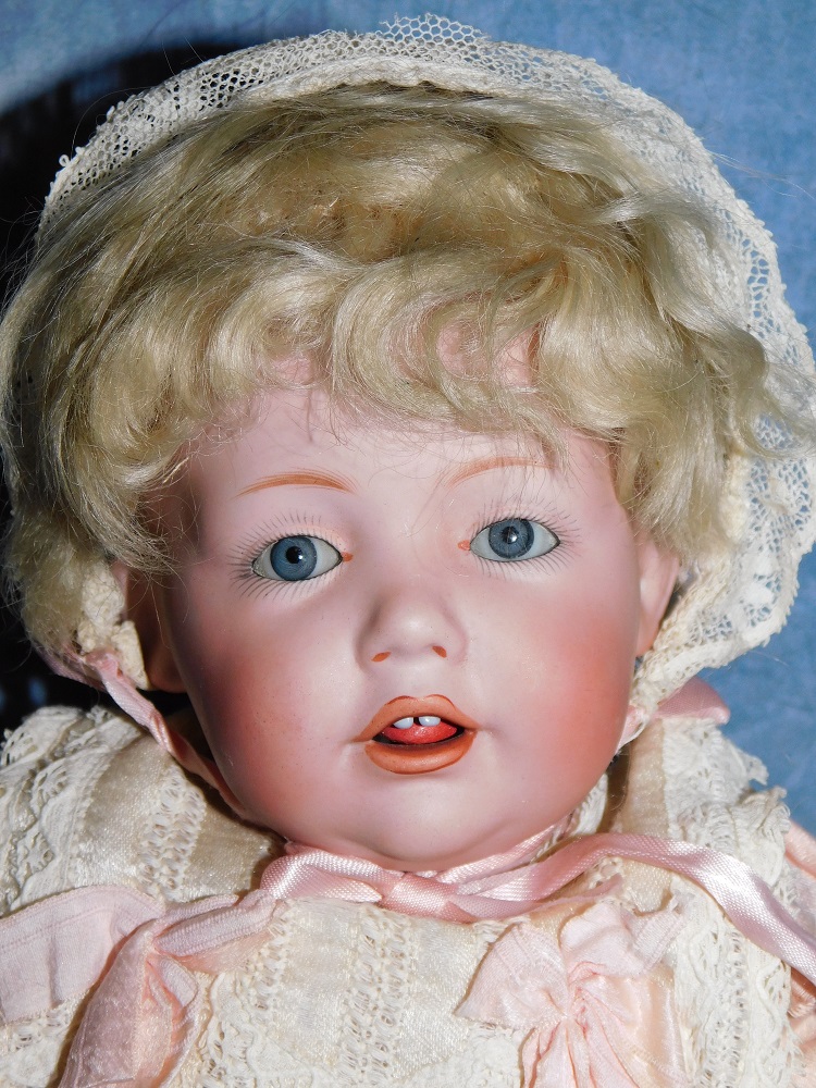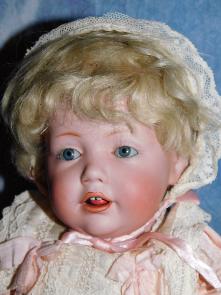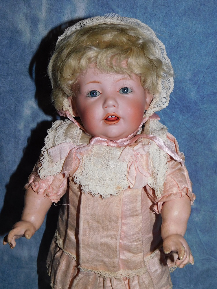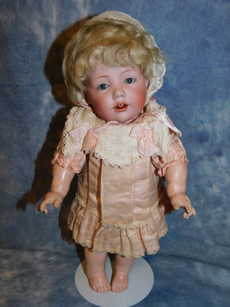 13" JDK #245 "Hilda" Toddler, gorgeous blue sleep eyes, mint bisque, original blonde mohair wig and original Kestner plaster pate. She wears her original pink brushed cotton dress with lace and ribbons, an antique lace hat and her original undergarment. She is on her great original JDK fully jointed chunky toddler body with straight wrists and the original finish. She has two upper teeth, a molded tongue and outlined lips. I haven't had one this great in a long time. Darling cabinet size. Adorable little JEWEL!!
