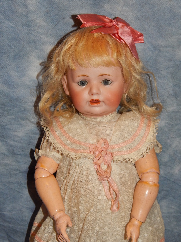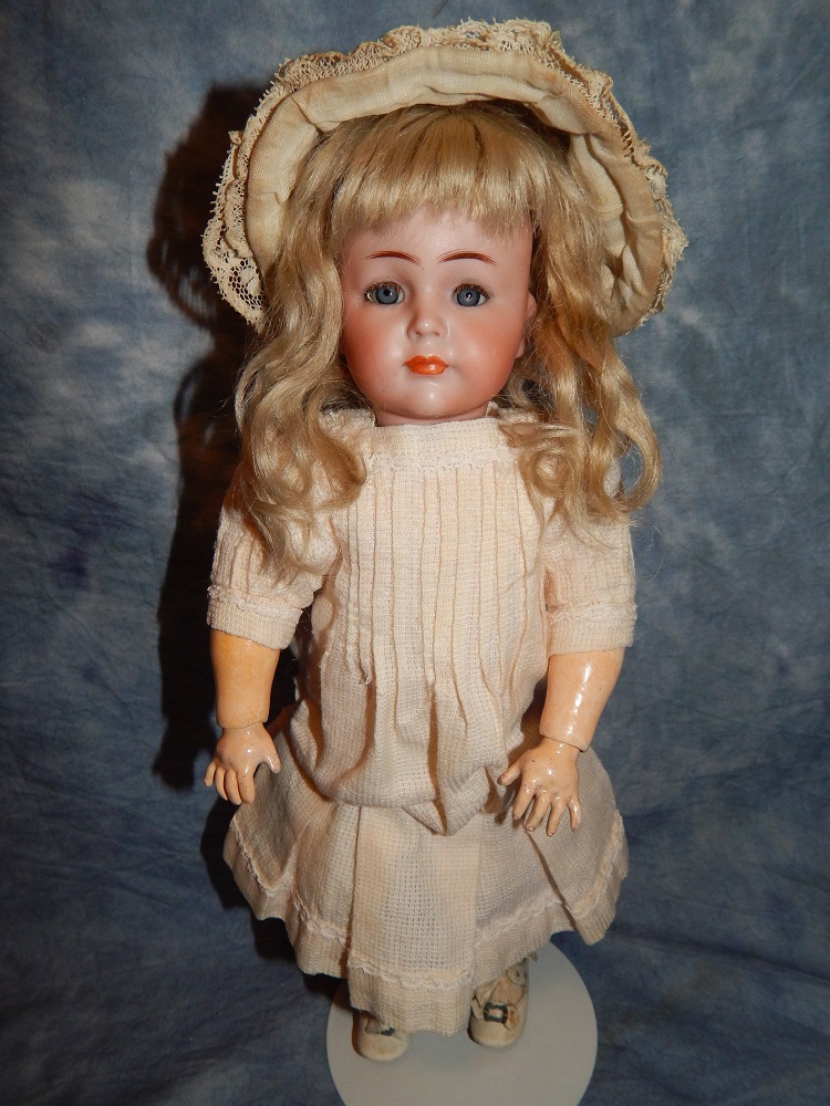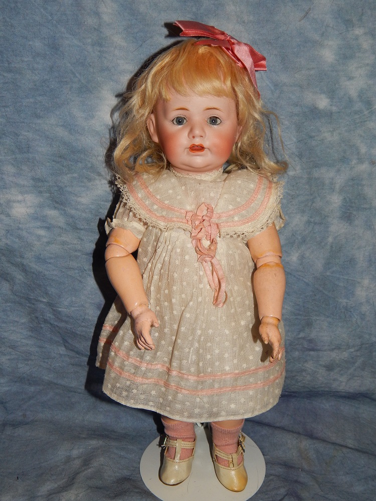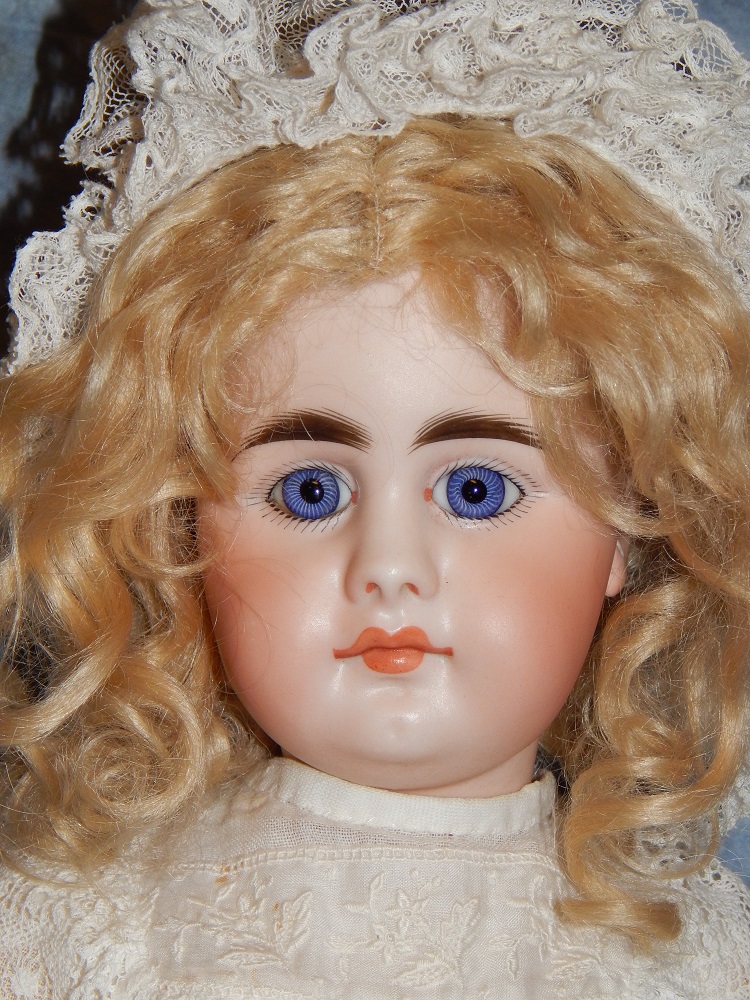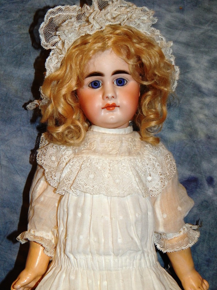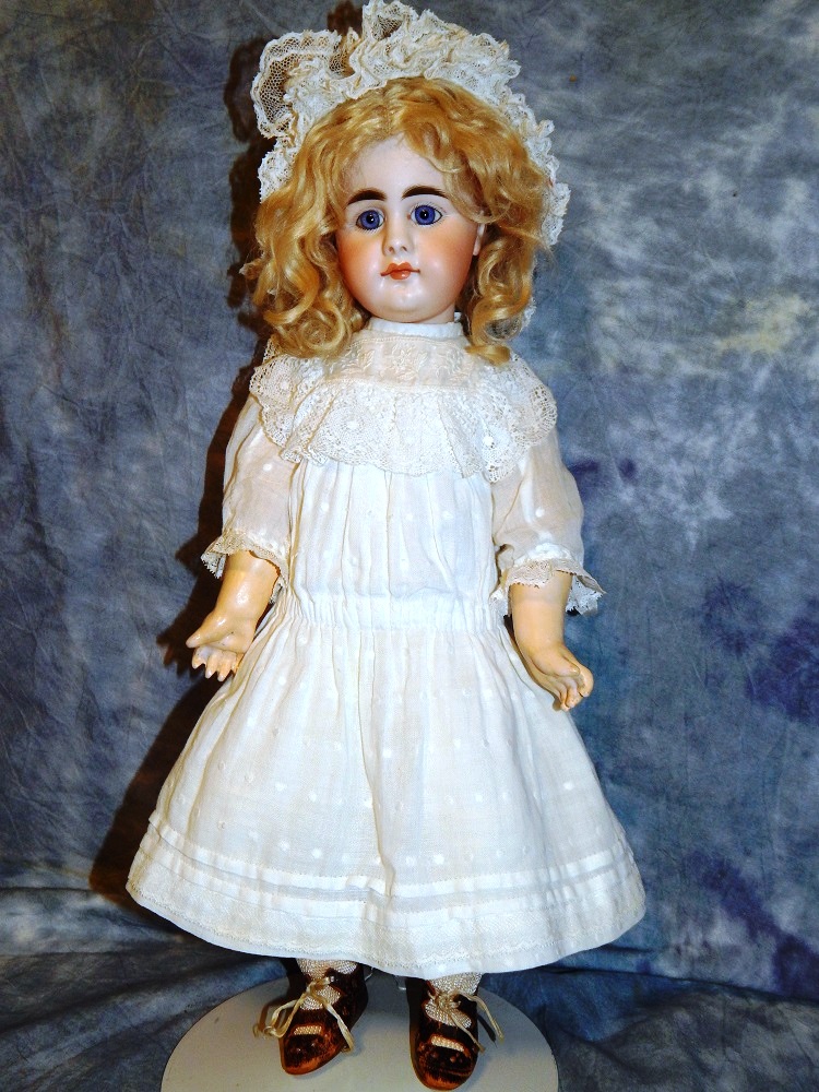 17" Simon & Halbig #949 Closed Mouth, closed dome, bulging blue paperweight eyes and her original blonde mohair wig. She wears her original Swiss dotted batiste dress, antique slip and undies and her original shoes. She is on her early original straight wrist body with the original finish. She is ABSOLUTELY STUNNING!!!