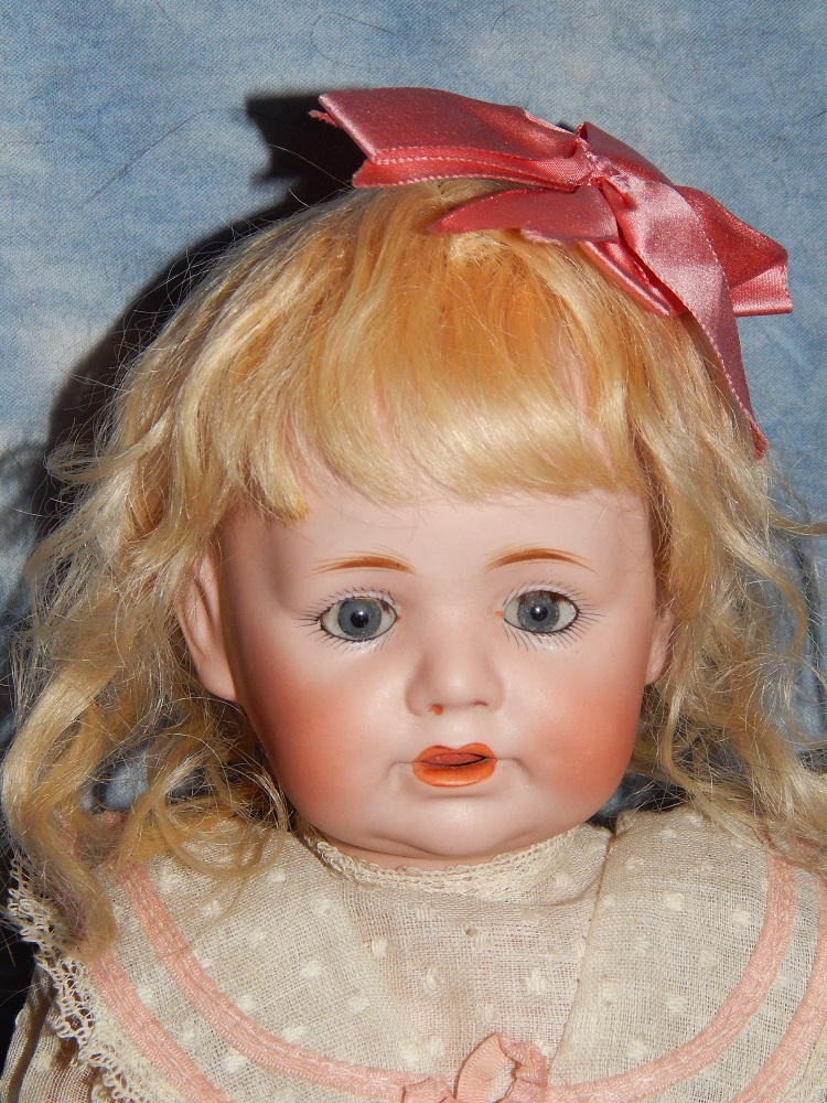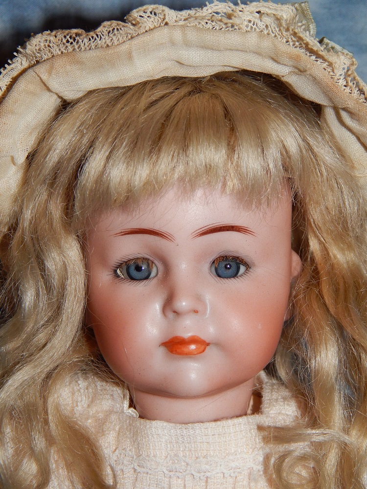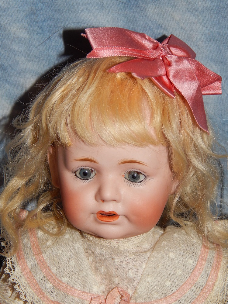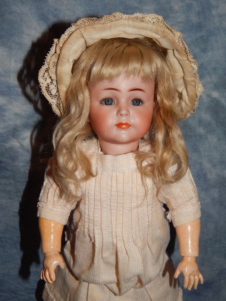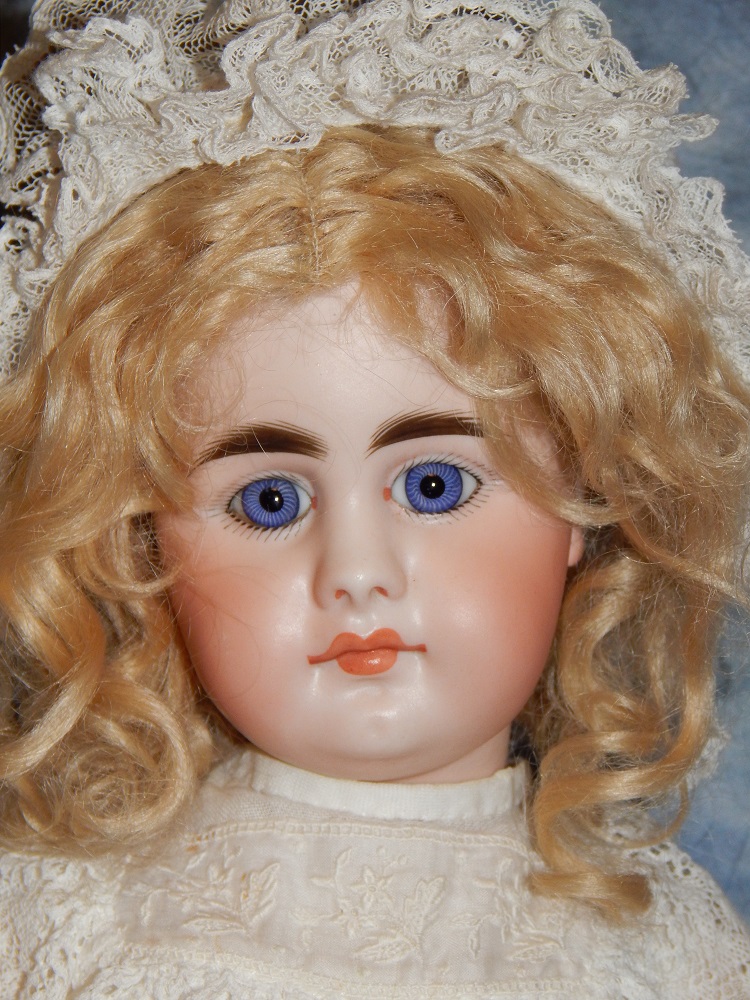 17" Simon & Halbig #949 Closed Mouth, closed dome, bulging blue paperweight eyes and her original blonde mohair wig. She wears her original Swiss dotted batiste dress, antique slip and undies and her original shoes. She is on her early original straight wrist body with the original finish. She is ABSOLUTELY STUNNING!!!