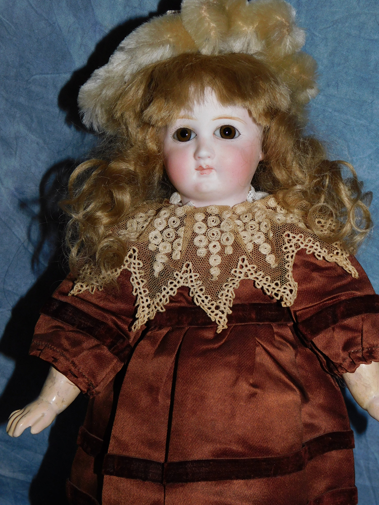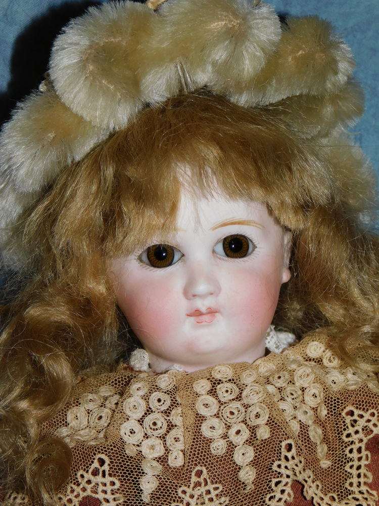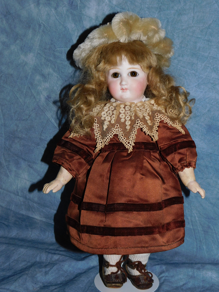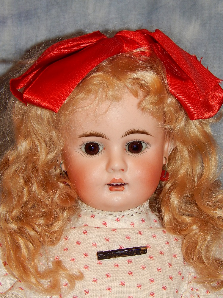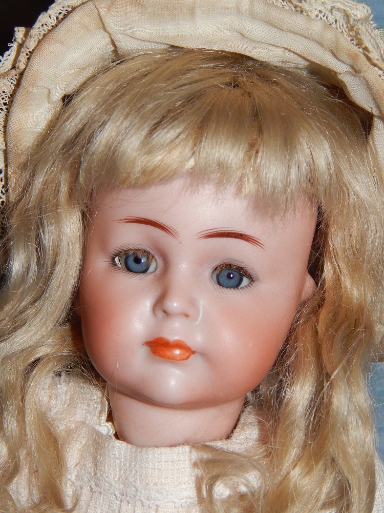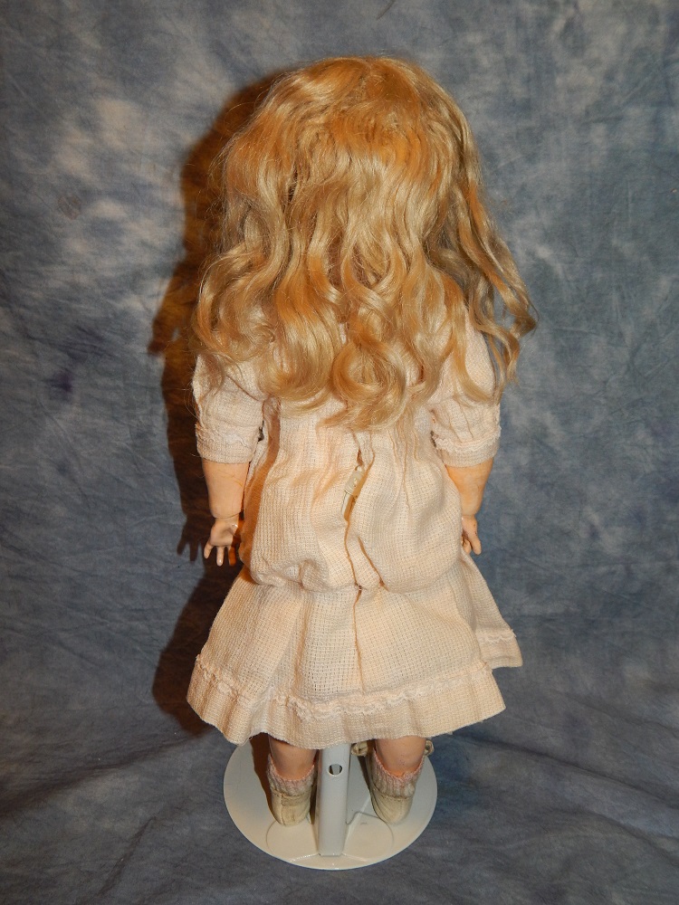 17" Simon & Halbig #949 Closed Mouth, closed dome, bulging blue paperweight eyes and her original blonde mohair wig. She wears her original Swiss dotted batiste dress, antique slip and undies and her original shoes. She is on her early original straight wrist body with the original finish. She is ABSOLUTELY STUNNING!!!