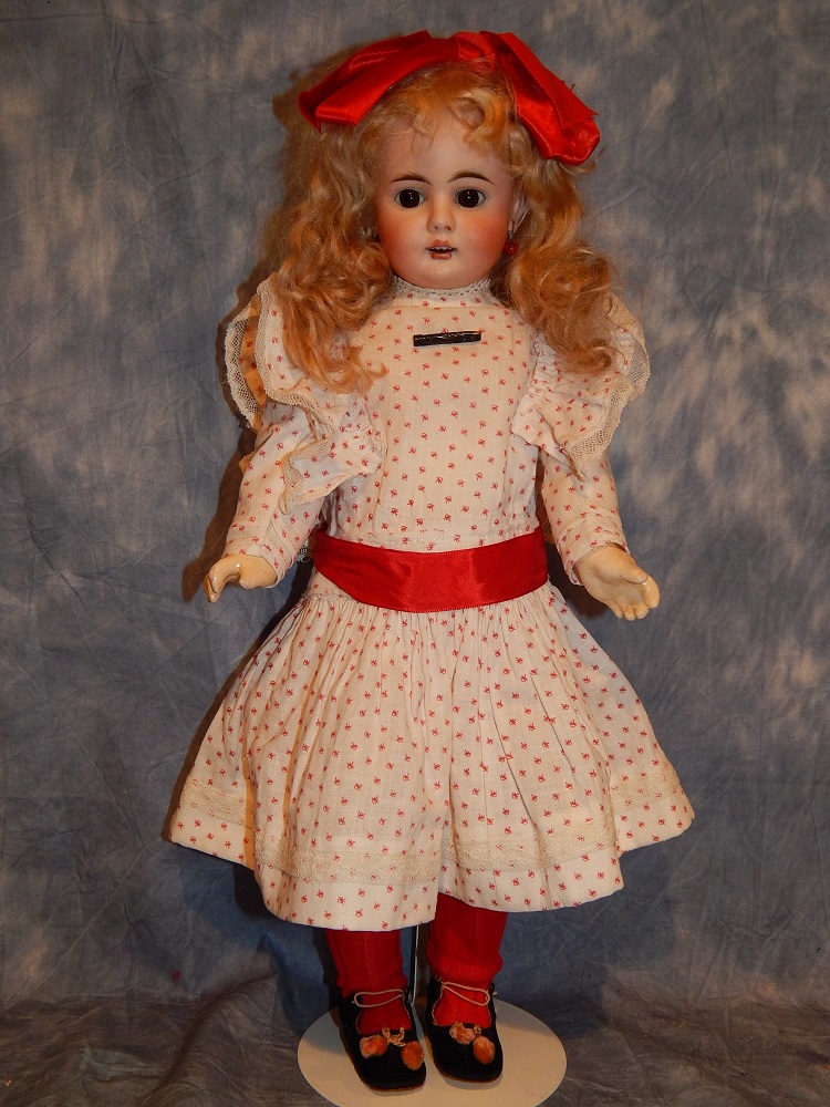 15" Bahr & Proschild #224, brown paperweight eyes with painted upper and lower lashes, perfect pale bisque and a blonde newer mohair wig. She wears a vintage red and white dress, original undies and antique shoes. She is on her early original "straight" wrist BP body with the original finish. A BEAUTIFUL girl made for the French trade.