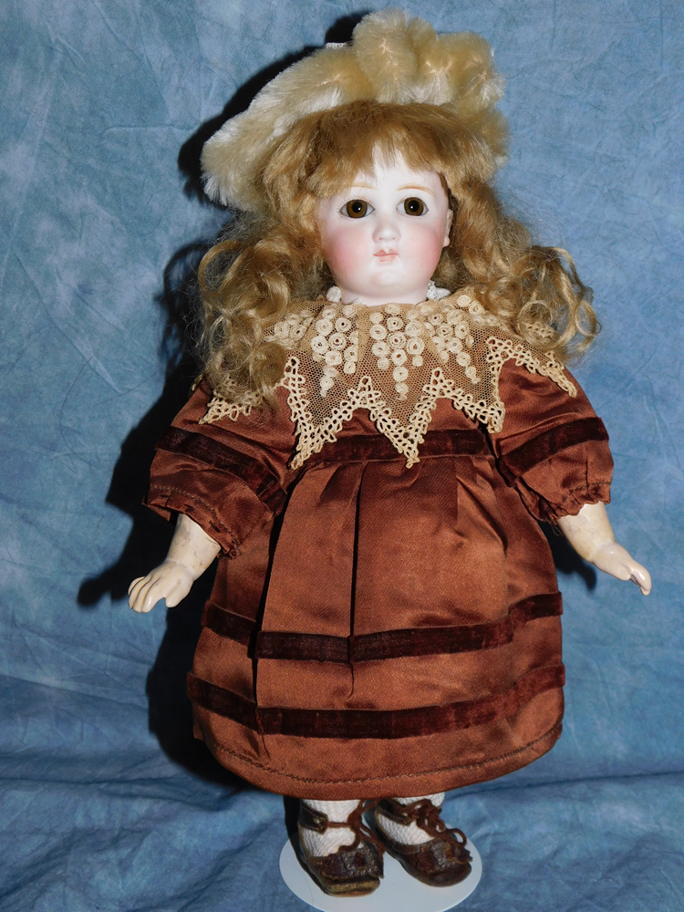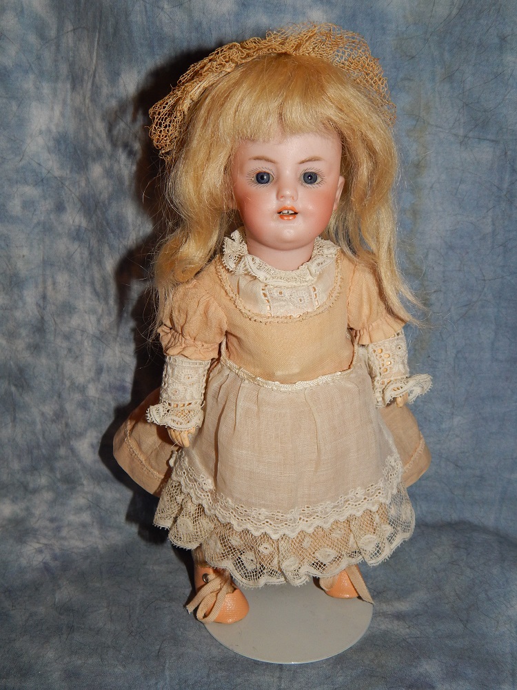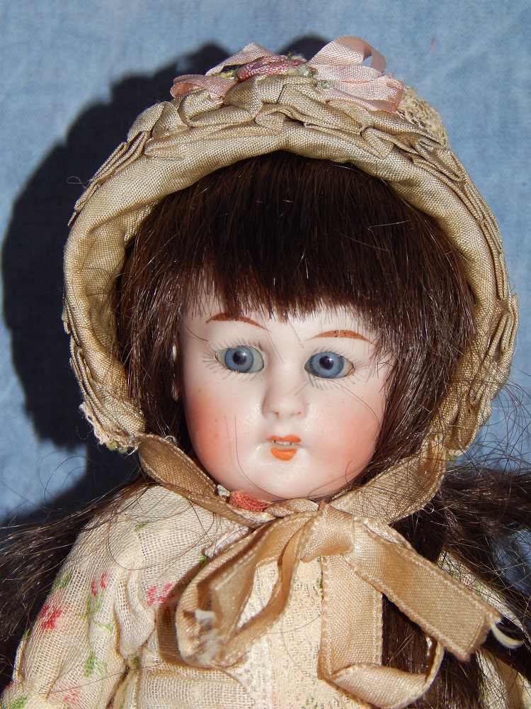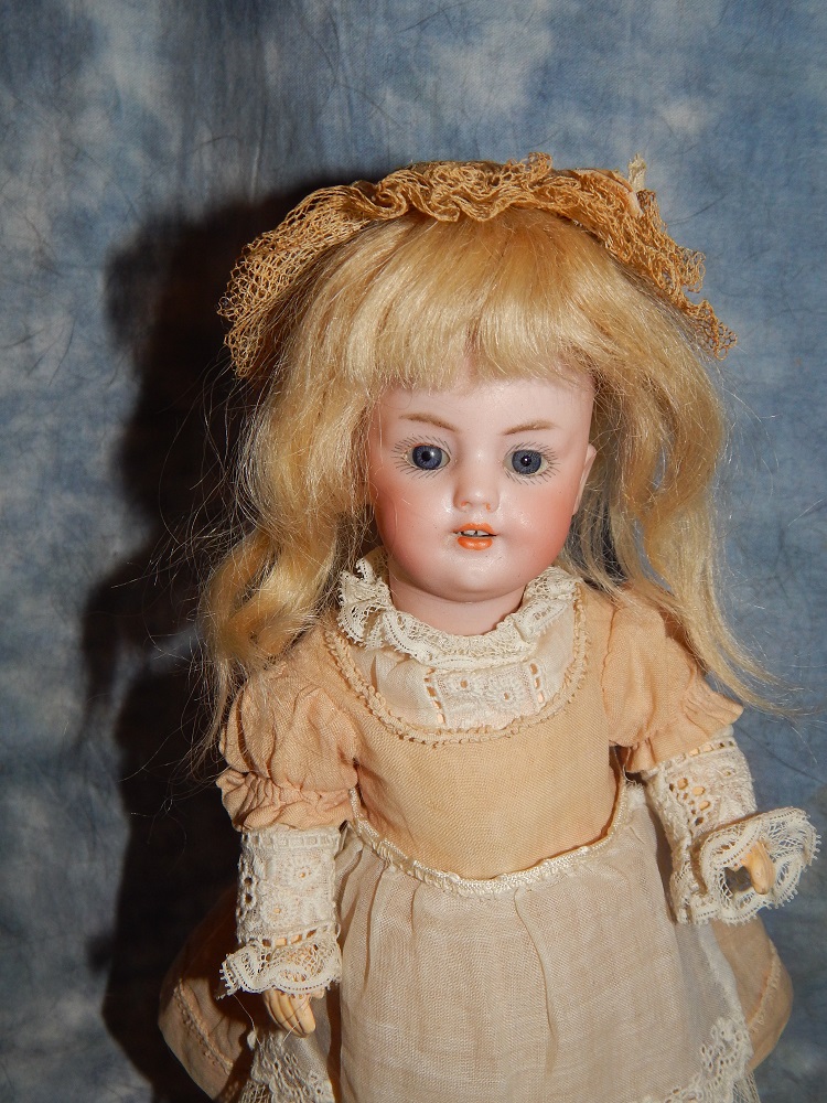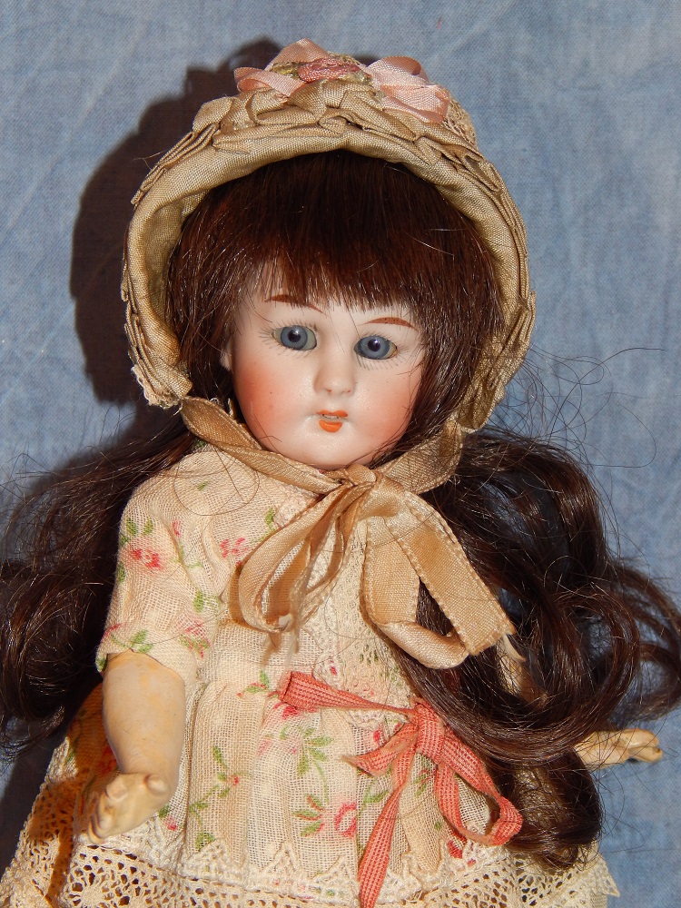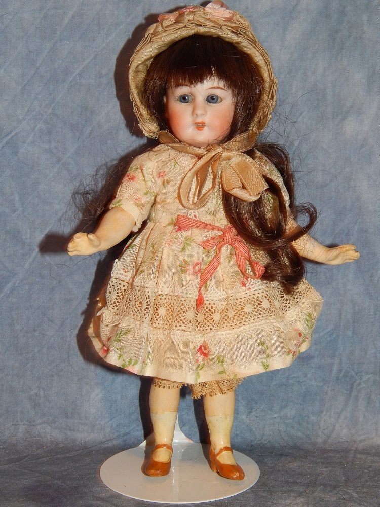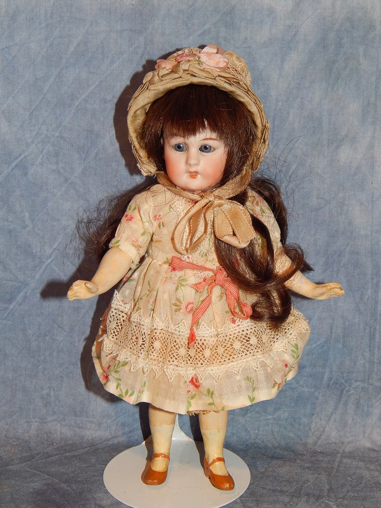 8" Simon & Halbig #1078, perfect pale bisque, blue sleep eyes with painted upper and lower lashes, open mouth with early square cut upper teeth, gorgeous long brunette human hair wig and her original pate. She wears her original silk and lace ecru dress with flowers, her original matching slip and pantaloons, painted shoes and socks and an added antique hat. She is on her original S & H body with the original finish. She is a tiny cabinet sized BEAUTY!!!