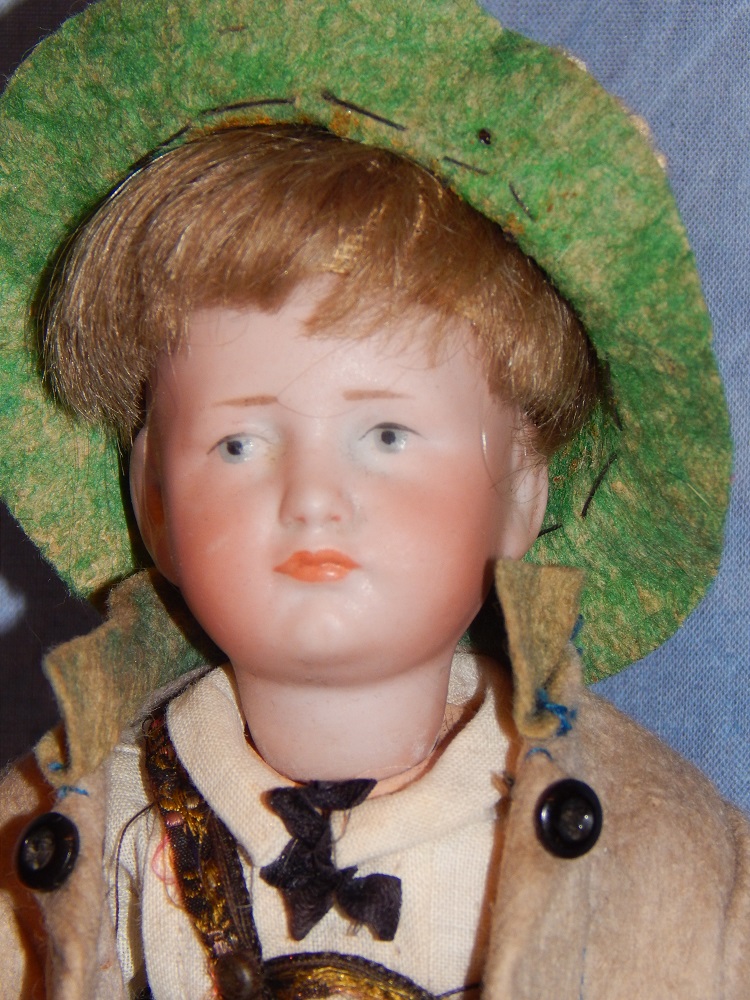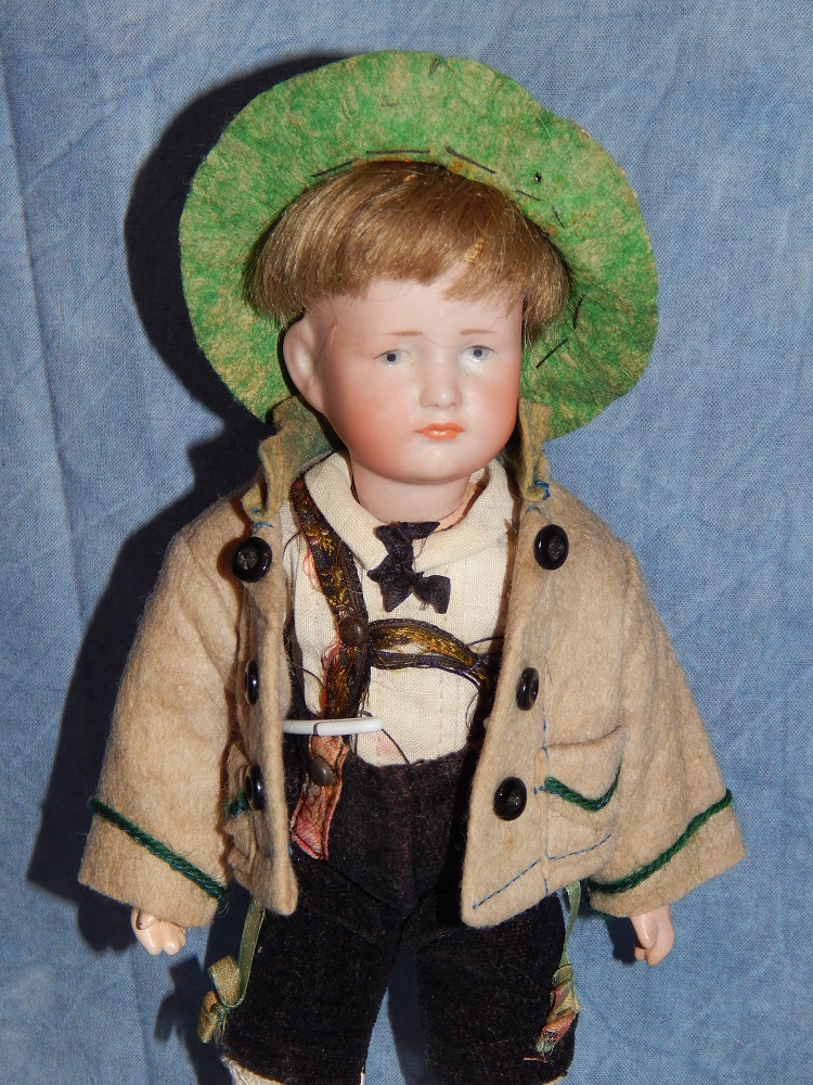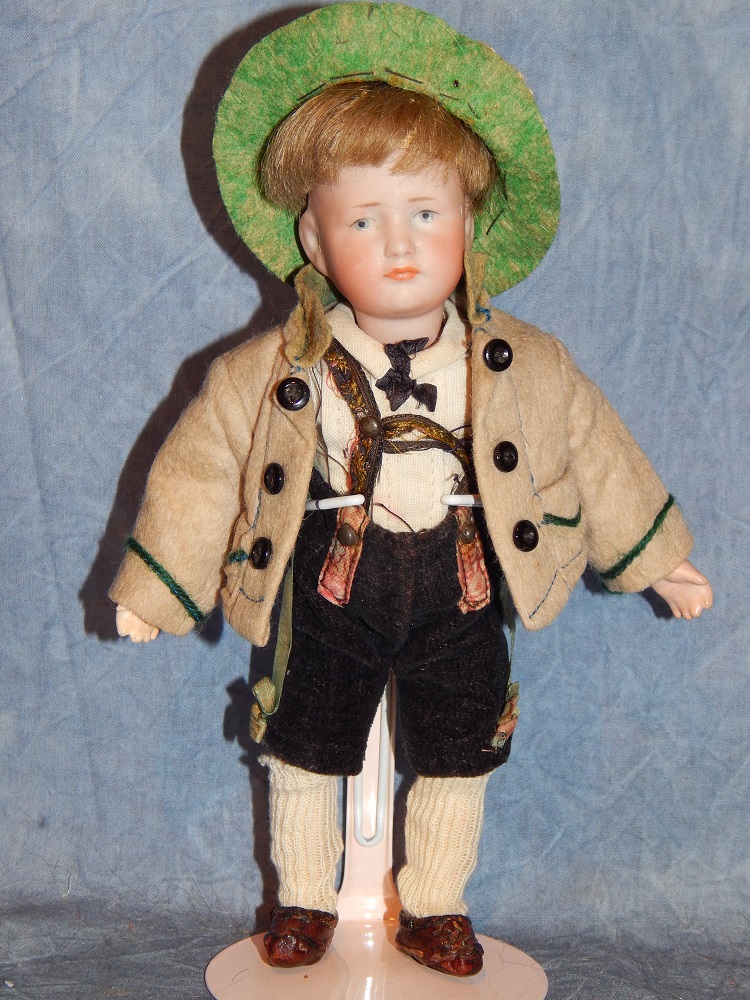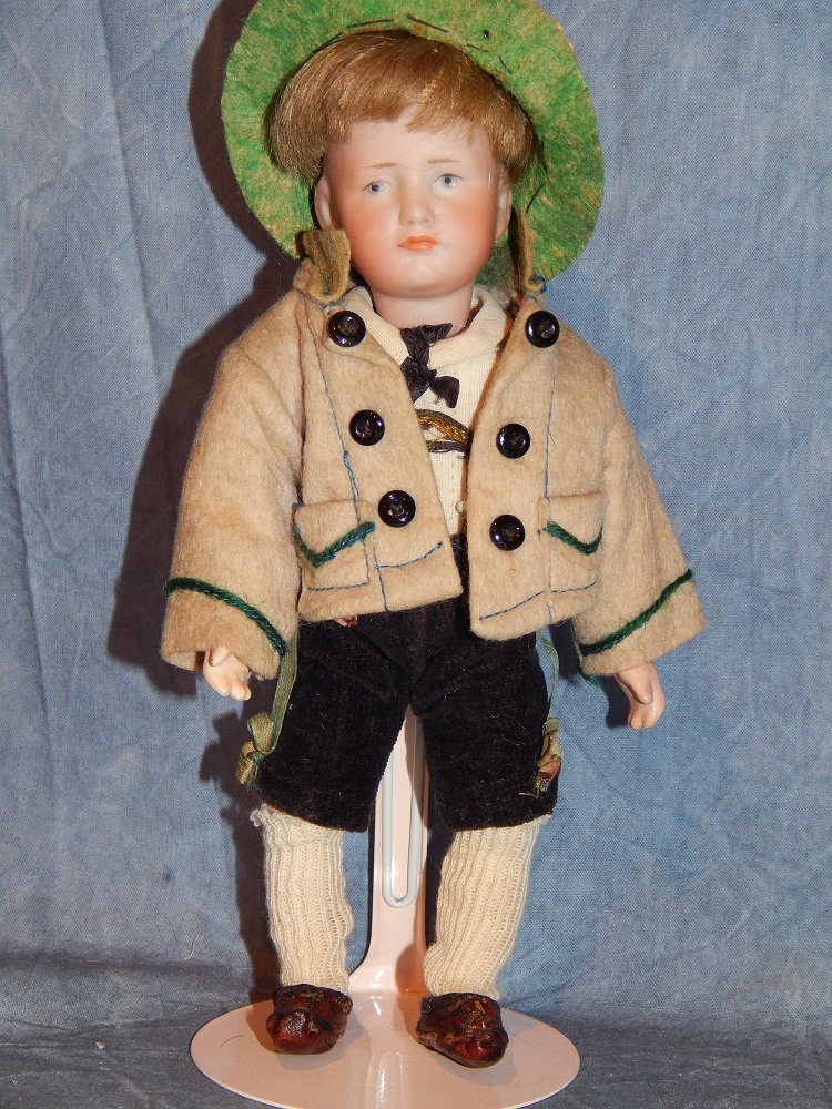 7.5" K * R 114 "Hans" Character, perfect bisque, blue intaglio eyes and his original dark blonde mohair wig. He wears his complete "FACTORY" original costume with his tan wool jacket, cotton shirt and tie, velvet knickers with suspenders and his original shoes, socks and green felt hat. He is on his "fully" jointed K * R body with it's perfect original finish. He is as cute as can be and is the smallest size made with the "fully jointed body". His original clothing is fabulous!!! A little GEM!!!